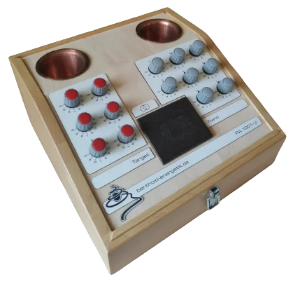 Klassisches Radionikgerät mit Reglern, Reibeplatte und Probenbechern.